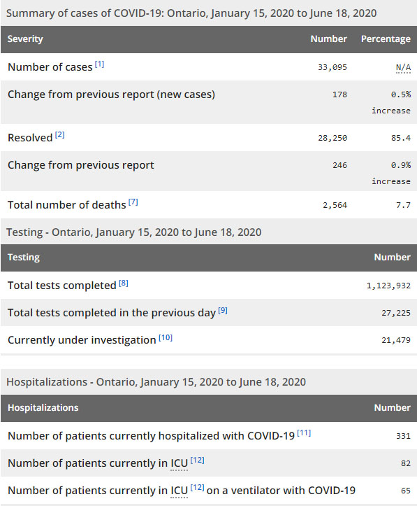 再看看安省方面的详细数据,截止6月18日上午10:30点,安省已对1123932例行了新冠病毒检测(检测数较昨天新增27225例),还有21479处于被调查阶段。确诊总数33095(较昨天新增178,确诊率下降至0.65%),包括28250例康复(康复率为85.4%)、2564例死亡(截止6月19日死亡又增加到2614例,这是CBC统计的最新死亡数据,死亡人数较昨天增加9例,死亡率为7.9%)。住院患者331例(减少20例,连续3日少于400以下);进入ICU患者82例(减少2);IU插呼吸机患者65例(增加5)。