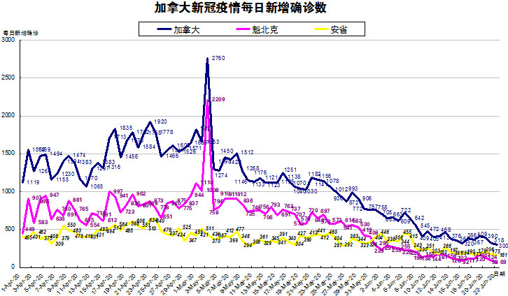 加国生活网小编统计了从4月1日至6月22日每日新增确诊数,制作了如下曲线图,分别统计了全加拿大(蓝色)和确诊数最多的两个省魁北克省(粉色)和安省(黄色)三组数据,大家可以了解一下进行4月份以来加拿大新冠疫情的发展趋势。加拿大、魁省和安省的新增确诊数继续较昨日均有所下降,特别是魁省69例属连续2日低于100例,安省也是连续2日低于200,致使加拿大从昨天的318下降到今天的300。