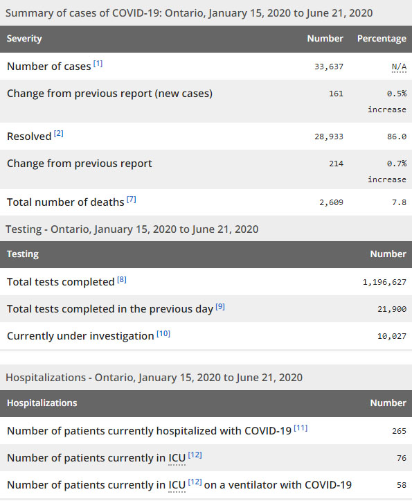 再看看安省方面的详细数据,截止6月21日上午10:30点,安省已对1196627例行了新冠病毒检测(检测数较昨天新增21900例),还有10027处于被调查阶段。确诊总数33637(较昨天新增161,确诊率仍0.74%),包括28933例康复(康复率为86%)、2609例死亡(截止6月22日死亡又增加到2654例,这是CBC统计的最新死亡数据,死亡人数较昨天增加7例,死亡率为7.9%)。住院患者265例(减少21,连续2日少于300以下);进入ICU患者76例(减少10);IU插呼吸机患者58例(减少1)。
