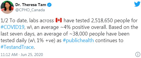 —— 加拿大首席公共卫生官谭咏诗(Theresa Tam)博士6月25日在Twitter上表示,目前250多万加拿大人接受了新冠病毒的检测,平均约有4%的人呈阳性,确诊病例超过10万。最近一周,每天约有3.8万加拿大人接受检测。