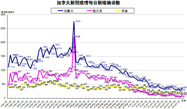 加国生活网小编统计了从4月1日至6月25日每日新增确诊数,制作了如下曲线图,分别统计了全加拿大(蓝色)和确诊数最多的两个省魁北克省(粉色)和安省(黄色)三组数据,大家可以了解一下进行4月份以来加拿大新冠疫情的发展趋势。加拿大、魁省和安省的新增确诊数继续较昨日有所上升,究其原因,魁省从昨天的53上升至142;安省从昨天163上升到189,从而致使加拿大确诊数从昨天的279上升至380。