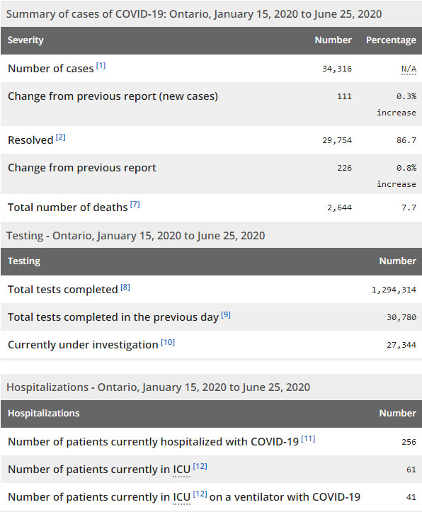 再看看安省方面的详细数据,截止6月25日上午10:30点,安省已对1294314例行了新冠病毒检测(检测数较昨天新增30780例,首次超过3万例),还有27344处于被调查阶段。确诊总数34316(较昨天新增111,确诊率下降至0.36%),包括29754例康复(康复率为86.7%)、2644例死亡(截止6月26日死亡又增加到2692例,这是CBC统计的最新死亡数据,死亡人数较昨天增加3例,死亡率下降为7.8%)。住院患者256例(减少14,连续5日少于300以下);进入ICU患者61例(减少8);IU插呼吸机患者41例(减少6)。