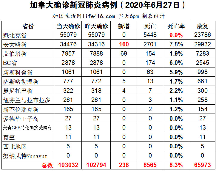 【加国生活网编译报道】截至6月27日下午6点,加拿大确诊新冠病例总数103032(当日新增238),死亡8565。魁省确诊总数55079(当日仍未发布数据);安省确诊总数34476例(当日新增160,连续4日低于200),死亡总数2701例(当日新增9例)。安省紧急命令延长至7月10日;多伦多所有户外公共游泳池于6月27开放,须提前登记;多伦多50个ASE超速摄像机将于7月6日正式启用,就算超1公里也要罚;加航和西捷航空将取消座位物理距离。加国生活网专门制作了如下统计数据表: