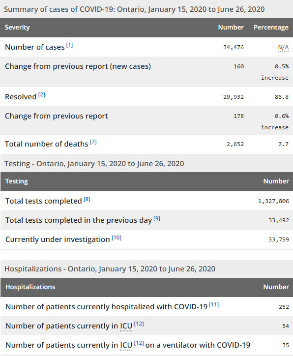 再看看安省方面的详细数据,截止6月26日上午10:30点,安省已对1327806例行了新冠病毒检测(检测数较昨天新增33492例,检测量达到历史最高值),还有33759处于被调查阶段。确诊总数34476(较昨天新增160,确诊率上升至0.48%),包括29932例康复(康复率为86.8%)、2652例死亡(截止6月27日死亡又增加到2701例,这是CBC统计的最新死亡数据,死亡人数较昨天增加9例,死亡率仍为7.8%)。住院患者252例(减少4,连续6日少于300以下);进入ICU患者54例(减少7);IU插呼吸机患者35例(减少6)。