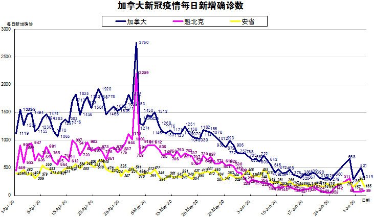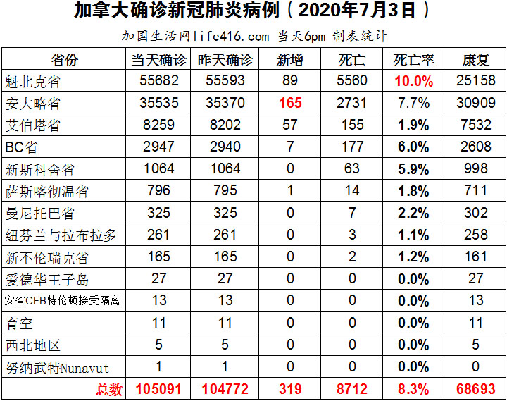 加国生活网小编统计了从4月1日至7月3日每日新增确诊数,制作了如下曲线图,分别统计了全加拿大(蓝色)和确诊数最多的两个省魁北克省(粉色)和安省(黄色)三组数据,大家可以了解一下进行4月份以来加拿大新冠疫情的发展趋势。由于安省和魁省的数据更新均恢复至常态,加拿大每日新增确诊病例也返回至319,包括安省新增的165和魁省新增的89。安省一直未能象魁省那样再降至100以下,而魁省的死亡率也在一直攀升,现在已经达到10%了。