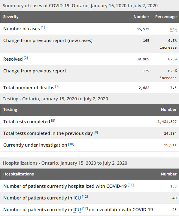再看看安省方面的详细数据,截止7月2日上午10:30点,安省已对1481897例行了新冠病毒检测(检测数较昨天新增24194例),还有15911处于被调查阶段。确诊总数35535(较昨天新增165,确诊率上升至0.68%),包括30909例康复(康复率上升至87%)、2682例死亡(截止7月3日死亡又增加到2731例,这是CBC统计的最新死亡数据,死亡人数较昨天增加3例,死亡率仍为7.7%)。住院患者155例(增加36);进入ICU患者40例(未变);IU插呼吸机患者25例(减少1)。
