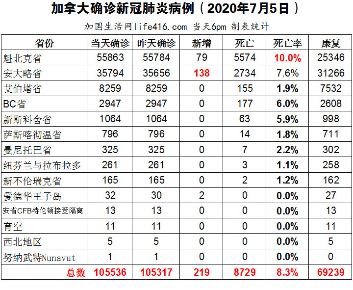 【加国生活网编译报道】截至7月5日下午6点,加拿大确诊新冠病例总数105536(当日新增219),死亡8729。魁省确诊总数55863(当日新增79),死亡5574,死亡率仍为10%;安省确诊总数35794(当日新增138),死亡总数2734(当日新增1)。PEI自2个月清零以来的新增确诊病例升至5例;多伦多Humber River医院ICU病房新冠患者首次清零;239名科学家联名要求世卫组织将新冠病毒传播方式改为气溶胶传播;加拿大国家免疫工作队正究竟到底有多少国民感染了新冠病毒。加国生活网专门制作了如下统计数据表: