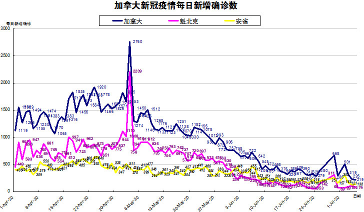 加国生活网小编统计了从4月1日至7月5日每日新增确诊数,制作了如下曲线图,分别统计了全加拿大(蓝色)和确诊数最多的两个省魁北克省(粉色)和安省(黄色)三组数据,大家可以了解一下进行4月份以来加拿大新冠疫情的发展趋势。加拿大和魁省当天的数据要比昨日有所下降,而安省又有所上升,从昨天的最低值121又上升到138,好在已经连续6天低于200以下,小编想问的是:安省何时能低到100以下啊!