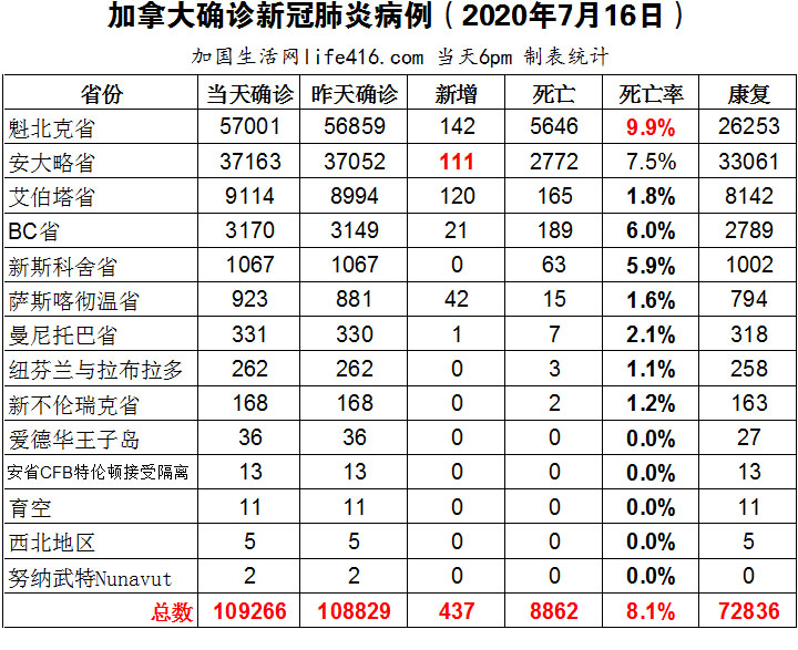 【加国生活网编译报道】截至7月16日下午6点,加拿大确诊新冠病例总数109266(当日新增437),死亡8862。魁省确诊总数57001(当日新增142),死亡5646,死亡率9.9%;安省确诊总数37163(当日新增111),死亡总数2772(当日新增2)。加拿大新冠死亡率高的原因与心脏病和中风患病率有关;BC省新冠病毒实际感染人数可能是报告病例的8倍;安省紧急令延长至7月29日。加国生活网专门制作了如下统计数据表: