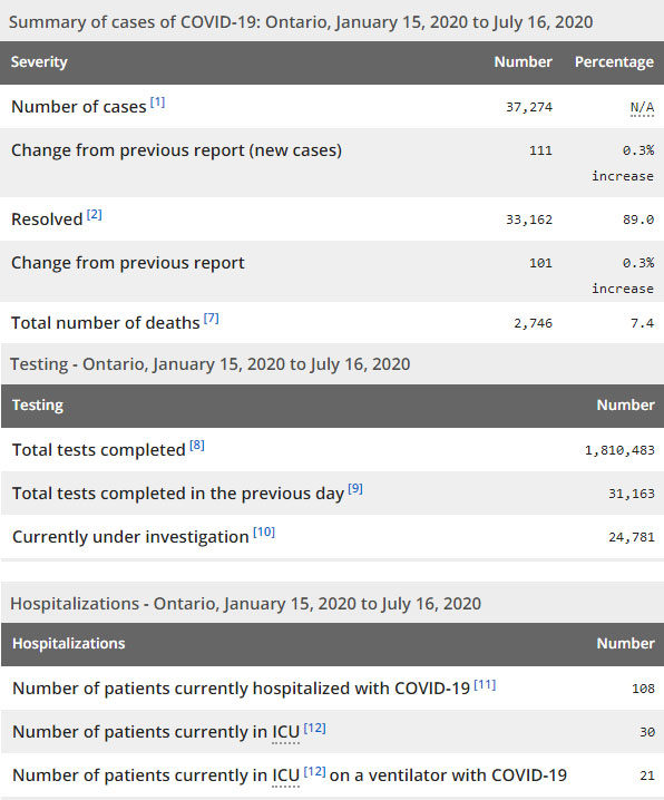 再看看安省方面的详细数据,截止7月16日上午10:30点,安省已对1810483例行了新冠病毒检测(检测数较昨天新增31163例),还有24781处于被调查阶段。确诊总数37274(较昨天新增111,确诊率下降至0.36%),包括33162例康复(康复率仍为89%)、2746例死亡(截止7月17日死亡2782例,这是CBC统计的最新死亡数据,死亡人数较昨天增加10,死亡率仍为7.5%)。住院患者108例(增加1);进入ICU患者30例(增加4);IU插呼吸机患者21例(增加1)。
