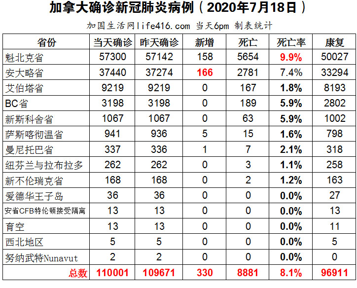 【加国生活网编译报道】截至7月18日下午6点,加拿大确诊新冠病例总数110001(当日新增330),死亡8881。魁省确诊总数57300(当日新增158),死亡5654,死亡率9.9%;安省确诊总数37440(当日新增166),死亡总数2781(当日未有新增反而撤回1例)。联邦政府拒绝了蓝鸟队在多伦多主场比赛申请;加拿大购物资为接种疫苗做准备,每个加拿大人至少两针;安省当天新增病例反弹至166例,创最近8天新高。加国生活网专门制作了如下统计数据表: