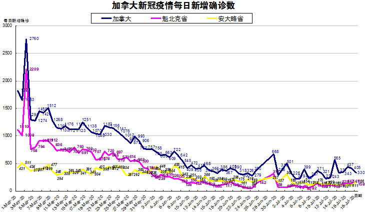 加国生活网小编统计了从5月1日至7月18日每日新增确诊数,制作了如下曲线图,分别统计了全加拿大(蓝色)和确诊数最多的两个省魁北克省(粉色)和安省(黄色)三组数据,大家可以了解一下进行5月份以来加拿大新冠疫情的发展趋势。加拿大较昨天又有一些下降,从昨天的405下降到今天的330,主要是一些省份在周末没有更新,而魁省和安省反而有些上升,魁省从昨天的141小降至今天的158;安省从昨天的111上升至166,连续19天在200以下。
