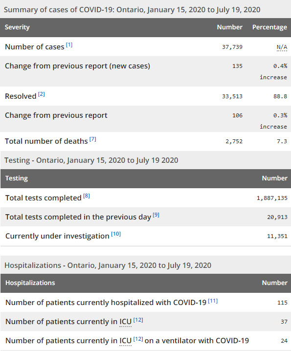 再看看安省方面的详细数据,截止7月19日上午10:30点,安省已对1887135例行了新冠病毒检测(检测数较昨天新增20913例),还有11351处于被调查阶段。确诊总数37739(较昨天新增135,确诊率上升至0.65%),包括33513例康复(康复率仍为88.8%)、2752例死亡(截止7月20日死亡2785例,这是CBC统计的最新死亡数据,死亡人数较昨天增加4例,死亡率仍为7.4%)。住院患者115例(增加14);进入ICU患者37例(增加3);IU插呼吸机患者24例(增加1)。