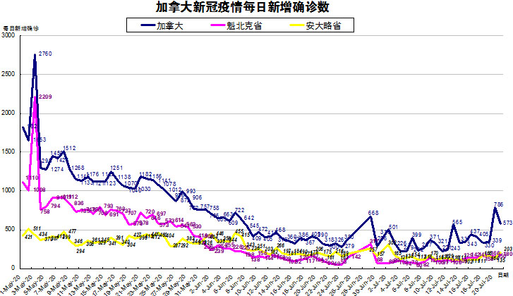 加国生活网小编统计了从5月1日至7月21日每日新增确诊数,制作了如下曲线图,分别统计了全加拿大(蓝色)和确诊数最多的两个省魁北克省(粉色)和安省(黄色)三组数据,大家可以了解一下进行5月份以来加拿大新冠疫情的发展趋势。加拿大较昨天虽有所下降,从昨天的786下降到今天的573,但艾省和BC省的疫情“崛起”让人实在是忧心,艾省新增了141,BC省新增了28,而魁省和安省也好不到哪里去,魁省从昨天的150上升到今天的180,安省更是从昨天的135猛升到今天的203,突破了保持了21天的200以下的界限,真愁人啊!!