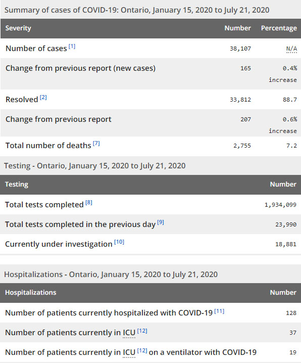 再看看安省方面的详细数据,截止7月21日上午10:30点,安省已对1934099例行了新冠病毒检测(检测数较昨天新增23990例),还有18881处于被调查阶段。确诊总数38107(较昨天新增165,确诊率下降至0.69%),包括33812例康复(康复率上升至88.7%)、2755例死亡(截止7月22日死亡2789例,这是CBC统计的最新死亡数据,死亡人数较昨天增加4例,死亡率仍为7.3%)。住院患者128例(增加8);进入ICU患者37例(增加1);IU插呼吸机患者19例(减少4)。