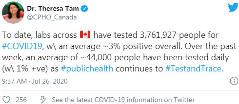 —— 根据加拿大首席卫生官Dr. Theresa Tam在其Twitter所发布的数据显示,截止7月26日,加拿大共检测了3,761,927,当天确诊113911,确诊率为3%(世界卫生组织设定的目标是使阳性确诊率保持在5%以下)。 在过去一周中,每天平均有约44,000人接受测试。