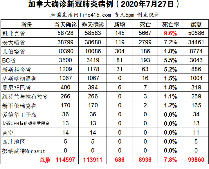 【加国生活网编译报道】截至7月27日下午6点,加拿大确诊新冠病例总数114597(当日新增686),死亡8936。魁省确诊总数58728(当日新增145);安省确诊总数38799(当日新增119);艾省和BC省终于更新了,艾省确诊总数10390(当日新增304),BC省确诊总数3500(当日新增81);新斯科舍省总数1209(当日新增31)。BC省周末三天新增81例新确诊病例,一家蓝莓包装厂爆发疫情15人确诊;艾伯塔省周末三天新增304例确诊病例;安省当天新增119例,其中40岁以下76例占64%。加国生活网专门制作了如下统计数据表: