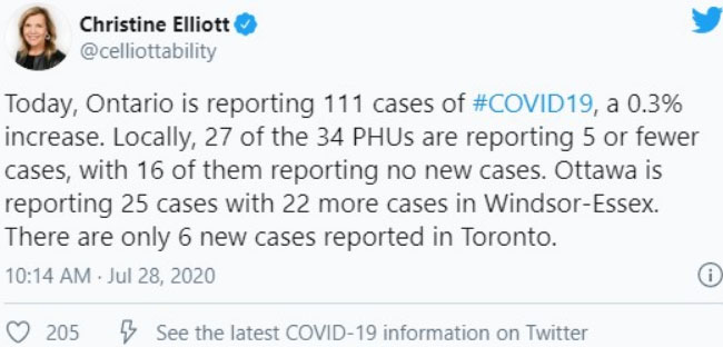 —— 安省在7月28日新增111例,其中渥太华25例、Windsor-Essex22例、尼亚加拉13例,这三个区加在一起,占了全省新增病例的54%。而整个GTA不到20例,多伦多仅6例。安省卫生厅长叶丽雅(Christine Elliott)在7月28日发Twitter说:“从各地区来看,34个公共卫生局中,有27个最多增加5例或更少,其中16个则完全没有报告新增病例。”