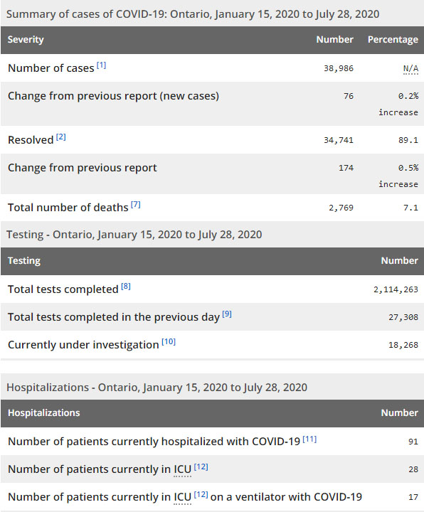 再看看安省方面的详细数据,截止7月28日,安省已对2114263例行了新冠病毒检测(检测数较昨天新增27308例),还有18268处于被调查阶段。确诊总数38968(较昨天新增76,确诊率下降至0.28%),包括34741例康复(康复率上升为89.1%)、2769例死亡(截止7月29日死亡2806例,这是CBC统计的最新死亡数据,死亡人数较昨天增加4例,死亡率仍为7.2%)。住院患者91例(减少5);进入ICU患者28例(减少3);IU插呼吸机患者17例(减少1)。