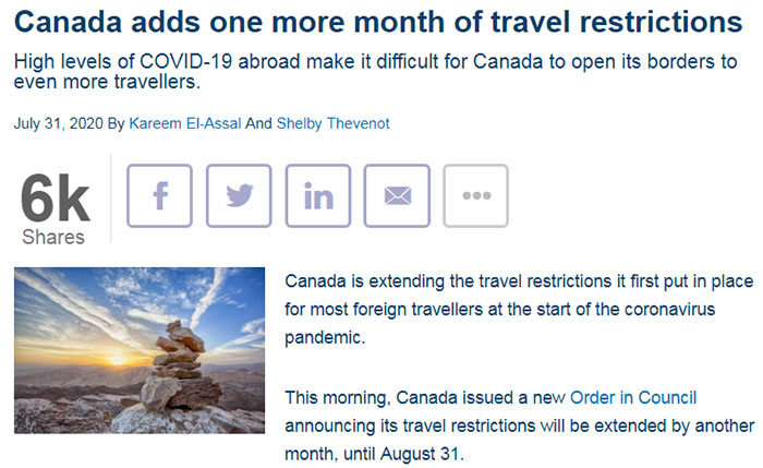 —— 加拿大政府7月30日在官网上发布正式通知:将原定于7月31日到期的旅行禁令再延长一个月至8月31日。这意味着持旅行签证的外国居民(PR、留学生、直系亲属等群体除外)仍然无法进入加拿大。而中国的边境目前也是关闭,所有外国公民即使持有居留许可,均无法入境。不仅如此,加拿大人和美国人以往可以自由跨过边境进行快速购物旅行或探望家人和朋友的日子也早已一去不复返了。自从加拿大联邦政府3月21日宣布关闭加美陆地边界后,关闭协议每30天审核一次,目前关闭日期是延长至8月21日止。那么边境何时会重开?来自不同领域的几位专家告诉CBC新闻,他们预测加美边境要到明年某个时候才能重新开放。