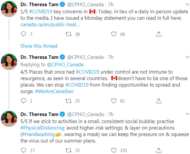 ——由于8月3日是Civic Day假期,安省卫生局没有更新当日新增确诊人数。但在之前连续三天,安省的每日新增确诊人数一直超过100例。除安省外,加拿大好几个省份也出现确诊人数反增的现象,这或许与夏季越来越多人出行且不注意公共卫生安全有关。对此,加拿大首席公共卫生官谭咏诗(Theresa Tam)博士在8月3日呼吁加拿大国民出行一定要注意健康防护,因为病毒不会在夏季的高温中消失,全力遏制第二波疫情卷土重来!“如果我们坚持在一个小的场所进行社交活动,那么一定要保持物理安全距离,并且加强防范措施(如洗手和戴口罩),大家一起努力了,一定可以将病毒从生活中消灭掉。”