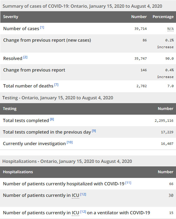 再看看安省方面的详细数据,截止8月4日,安省已对2295116例行了新冠病毒检测(检测数较昨天新增17229例),还有16407处于被调查阶段。确诊总数39714(较昨天新增86,确诊率上升至0.50%),包括35747例康复(康复率上升至90%)、2782例死亡(截止8月5日死亡2821例,这是CBC统计的最新死亡数据,死亡人数较昨天增加3例,死亡率仍为7.1%)。住院患者66例(减少12);进入ICU患者30例(增加2);IU插呼吸机患者15例(未变)。