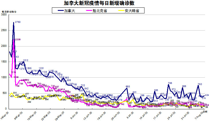 加国生活网小编统计了从5月1日至8月7日每日新增确诊数,制作了如下曲线图,分别统计了全加拿大(蓝色)和确诊数最多的两个省魁北克省(粉色)和安省(黄色)三组数据,大家可以了解一下进行5月份以来加拿大新冠疫情的发展趋势。加拿大较昨天又有大幅上升,从昨天的374上升至今天的424。魁省从昨天的133下降至今天的108;安省从昨天的95例下降至今天的88,连续五天低于100例。艾省和BC省的最近几天的情况继续不太乐观,BC省新增53,艾省新增134,甚至超过了以往的疫情大省魁省和安省,成为当天加拿大新增确诊人数最高省份。