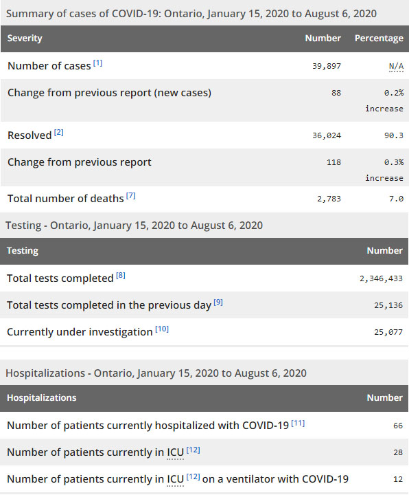 再看看安省方面的详细数据,截止8月6日,安省已对2346433例行了新冠病毒检测(检测数较昨天新增25136例),还有25077处于被调查阶段。确诊总数39897(较昨天新增88,确诊率下降至0.35%),包括36024例康复(康复率上升至90.3%)、2783例死亡(截止8月7日死亡2821例,这是CBC统计的最新死亡数据,死亡人数连续二日清零,死亡率仍为7.1%)。住院患者66例(减少5);进入ICU患者28例(减少1);IU插呼吸机患者12例(减少1)。
