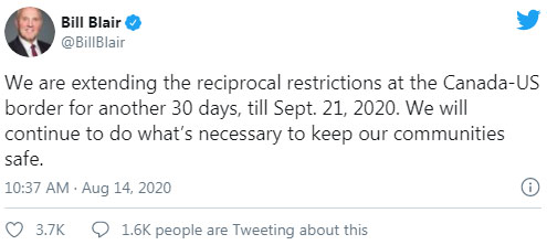 —— 加拿大联邦政府公共安全部长Bill Blair在8月14日宣布,联邦政府将关闭加拿大和美国的陆地边界再延长30天,直到9月21日。他在推特中说:“我们将继续做必要的事情,以确保我们社区的安全。”