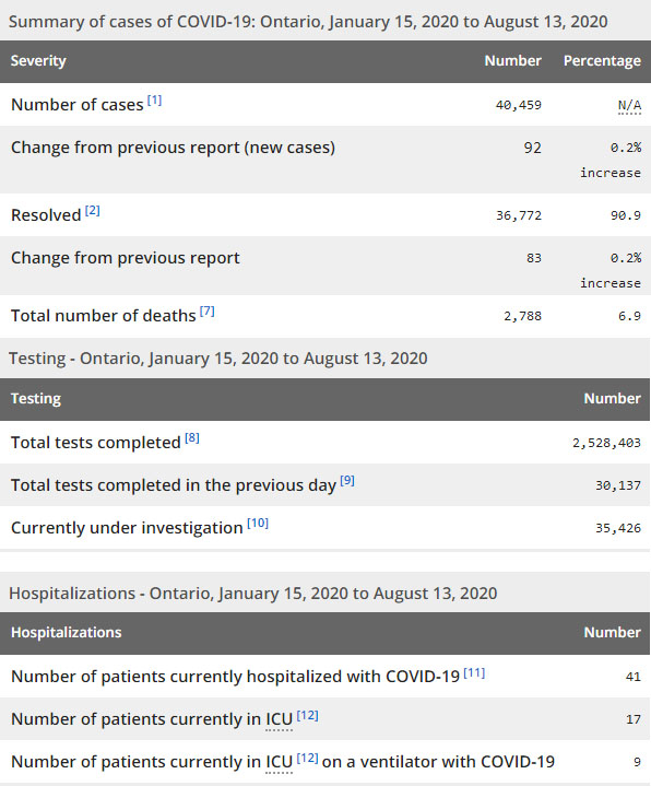再看看安省方面的详细数据,截止8月13日,安省已对2528403例行了新冠病毒检测(检测数较昨天新增30137),还有35426处于被调查阶段。确诊总数40459(较昨天新增92,确诊率上升至0.30%),包括36772例康复(康复率仍为90.9%)、2788例死亡(截止8月14日死亡2827例,这是CBC统计的最新死亡数据,死亡人数较昨天增加2例,死亡率仍为7.0%)。住院患者41例(减少2);进入ICU患者17例(减少3);IU插呼吸机患者9例(减少1)。