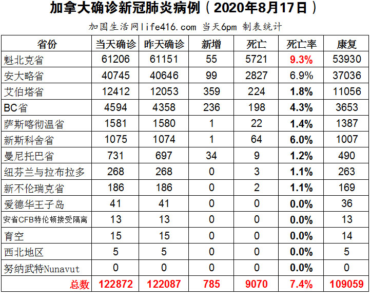 【加国生活网编译报道】截至8月17日下午6点,加拿大确诊新冠病例总数122872(当日新增785),死亡9070。魁省确诊总数61206(当日新增55);安省确诊总数40745(当日新增99,连续第二天低于100以下);艾省确诊总数12412(周末三天新增359)、BC省确诊总数4594(周末三天新增236)。艾省和BC省新增确诊病例仍然没有放缓迹象,BC省大多数新病例继续涉及年轻人且是轻度症状,有些人可能没有意识到他们已被感染了新冠病毒;安省教育部拒绝了多伦多教育局缩减班级人数和教学时间计划。加国生活网专门制作了如下统计数据表:
