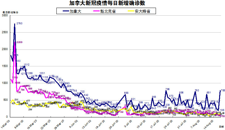 加国生活网小编统计了从5月1日至8月17日每日新增确诊数,制作了如下曲线图,分别统计了全加拿大(蓝色)和确诊数最多的两个省魁北克省(粉色)和安省(黄色)三组数据,大家可以了解一下进行5月份以来加拿大新冠疫情的发展趋势。加拿大较昨天又有大大大幅上升,从昨天的198上升至今天的785,主要是因为艾省和BC省终天更新周末三天的数据了,唉,加西各省疫情越来越严重了。加东方面,由于一直没有放松疫情控制,情况还不错,魁省从昨天的67下降至今天的55;安省从昨天的81例上升至今天的77,连续第二天下降到100以下。