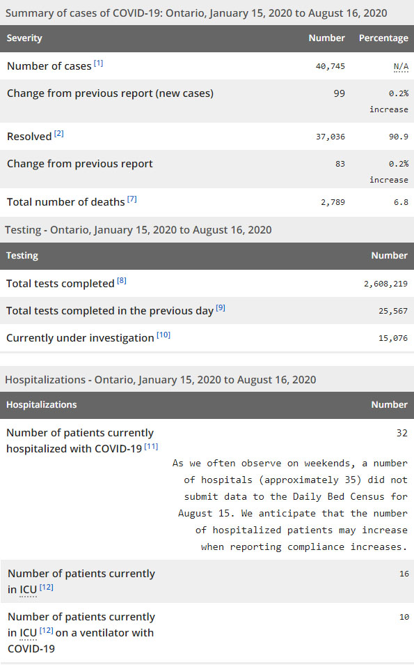 再看看安省方面的详细数据,截止8月16日,安省已对2608219例行了新冠病毒检测(检测数较昨天新增25567),还有15076处于被调查阶段。确诊总数40745(较昨天新增99,确诊率上升至0.39%),包括37036例康复(康复率仍为90.9%)、2789例死亡(截止8月16日死亡2827例,这是CBC统计的最新死亡数据,死亡人数较昨天没有增加,死亡率下降为6.0%)。住院患者32例(减少5);进入ICU患者16例(减少2);IU插呼吸机患者10例(增加1)。