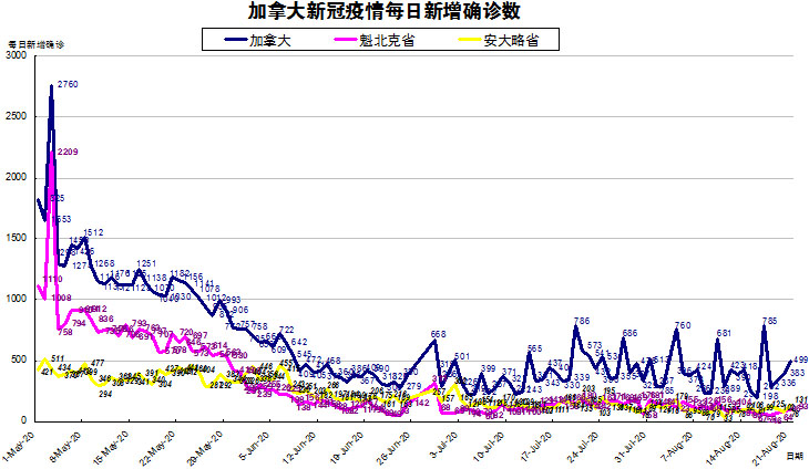加国生活网小编统计了从5月1日至8月21日每日新增确诊数,制作了如下曲线图,分别统计了全加拿大(蓝色)和确诊数最多的两个省魁北克省(粉色)和安省(黄色)三组数据,大家可以了解一下进行5月份以来加拿大新冠疫情的发展趋势。加拿大较昨天又有一些上升,从昨天的383上升至今天的499,贡献新增病例的省份由以前的2个省变成了4个省:艾省最多新增144、安省第二新增131、魁省第三新增93、BC省第四新增90,这4个省全部都有上升的趋势。