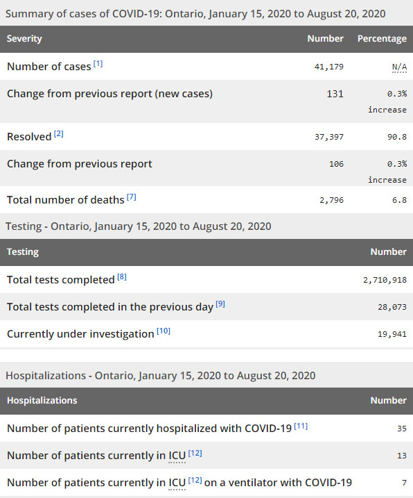 再看看安省方面的详细数据,截止8月20日,安省已对2710918例行了新冠病毒检测(检测数较昨天新增28073),还有19941处于被调查阶段。确诊总数41179(较昨天新增131,确诊率上升至0.47%),包括37397例康复(康复率仍为90.8%)、2796例死亡(截止8月21日死亡2832例,这是CBC统计的最新死亡数据,死亡人数较昨天增加3例,死亡率仍为6.9%)。住院患者35例(未变);进入ICU患者13例(减少2);IU插呼吸机患者7例(减少1)。