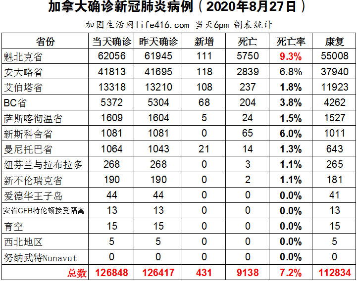 【加国生活网编译报道】截至8月27日下午6点,加拿大确诊新冠病例总数126848(当日新增431),死亡9138。安省确诊总数41813(当日新增118);魁省确诊总数62056(当日新增111);艾省确诊总数13318(当日新增108);BC省确诊总数5372(当日新增68)。艾省返校计划没有设定让学校关闭的新冠病例增加到多少的具体数字;多伦多教育局表示小学生在整个学年内的上学模式可以在面对面在校学习和在家网上学习之间进行自由转换;多伦多国际电影节于2020年9月10日至19日如期举行,受疫情影响举办方式有所变化。加国生活网专门制作了如下统计数据表:
