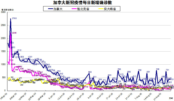 加国生活网小编统计了从5月1日至8月27日每日新增确诊数,制作了如下曲线图,分别统计了全加拿大(蓝色)和确诊数最多的两个省魁北克省(粉色)和安省(黄色)三组数据,大家可以了解一下进行5月份以来加拿大新冠疫情的发展趋势。加拿大较昨天又有小小下降,从昨天的448上升至今天的431,5个省每日数据又有交替变化,按新增确诊数排列分别是:安省新增118、魁省新增111、艾省新增1088、BC省新增68、曼省新增21。