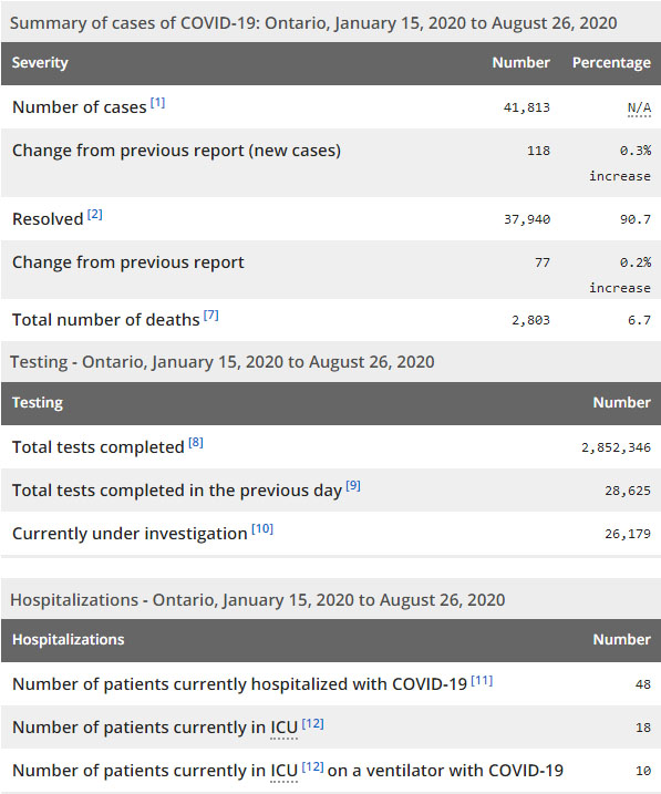 再看看安省方面的详细数据,截止8月26日,安省已对2852346例行了新冠病毒检测(检测数较昨天新增28625),还有26179处于被调查阶段。确诊总数41813(较昨天新增118,确诊率上升至0.41%),包括37940例康复(康复率下降为90.7%)、2803例死亡(截止8月27日死亡2839例,这是CBC统计的最新死亡数据,死亡人数较昨天减少1例,估计是统计数据出错造成的,死亡率仍为6.8%)。住院患者48例(增加5);进入ICU患者18例(增加3);IU插呼吸机患者10例(未变)。