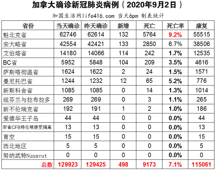 【加国生活网编译报道】截至9月2日下午6点,加拿大确诊新冠病例总数129923(当日新增498),死亡9173。安省确诊总数42554(当日新增133);魁省确诊总数62746(当日新增132);艾省确诊总数14180(当日新增114);BC省确诊总数5952(当日新增104)。魁省魁北克市一家酒吧的卡拉OK之夜引发越来越多新冠病例,省卫生官告诫省民新冠病毒可能潜伏在任何地方;9月开学在即,若在安省学校中出现新冠病例,看安省卫生部指南如何操作?加国生活网专门制作了如下统计数据表: