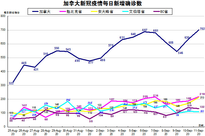由于加拿大目前的疫情格局已经不再是魁省和安省确诊病例最多的情况了,其他几个省份也渐渐开始加重起来,“第二波”疫情已经到来,所以加国生活网小编统计了从8月25日至9月11日的四个省份的新增确诊数,并制作了如下曲线图,大家可以了解一下加拿大目前新冠疫情的发展趋势。加拿大较昨天又一些上升,从昨天的630上升到今天的702,当日新增确诊数按省份排列分别是:魁省新增219、安省新增213、BC省新增132、艾省新增111、曼省新增15(低于50以下,没在图表内显示)、萨省新增12(低于50以下,没在图表内显示)。