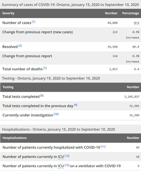 再看看安省方面的详细数据,截止9月10日,安省已对3245837例行了新冠病毒检测(检测数较昨天新增32501),还有31384处于被调查阶段。确诊总数44068(较昨天新增213,确诊率下降为0.66%),包括39598例康复(康复率下降仍为89.9%)、2813例死亡(截止9月11日死亡2855例,这个数据是CBC新闻是基于各地公共卫生部门的数据进行统计的,该方法避免了省级报告系统的滞后时间。死亡人数较昨天减少1例,死亡率仍为6.5%)。住院患者49例(减少5);进入ICU患者18例(增加4);IU插呼吸机患者9例(未变)。