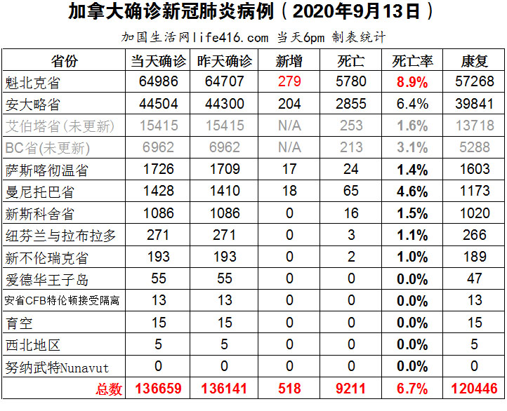 【加国生活网编译报道】截至9月13日下午6点,加拿大确诊新冠病例总数136659(当日新增518),死亡9211。魁省确诊总数64986(当日新增279);安省确诊总数44504(当日新增204)。全球新冠确诊病例创单日增幅最高纪录,24小时内新增307,930例,印度、美国和巴西增幅最大;加拿大首席公共卫生官告诫国民越是熟悉的环境越容易放宽个人防护措施;安省新增确诊病例连续第三天超过200例以上,有64%是40岁以下病患。加国生活网专门制作了如下统计数据表: