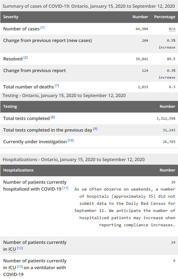 再看看安省方面的详细数据,截止9月12日,安省已对3,312,598例行了新冠病毒检测(检测数较昨天新增31143),还有26765处于被调查阶段。确诊总数44504(较昨天新增204,确诊率仍为0.65%),包括39841例康复(康复率下降仍为89.5%)、2815例死亡(截止9月13日死亡2855例,这个数据是CBC新闻是基于各地公共卫生部门的数据进行统计的,该方法避免了省级报告系统的滞后时间。死亡人数较昨天未变,死亡率仍为6.4%)。住院患者39例(减少4);进入ICU患者14例(增加2);IU插呼吸机患者9例(增加1)。