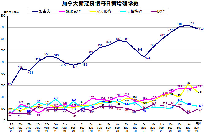 由于加拿大目前的疫情格局已经不再是魁省和安省确诊病例最多的情况了,其他几个省份也渐渐开始加重起来,“第二波”疫情已经到来,所以加国生活网小编统计了从8月25日至9月15日的四个省份的新增确诊数,并制作了如下曲线图,大家可以了解一下加拿大目前新冠疫情的发展趋势。加拿大较昨天有一些下降,当日按新增确诊数按省份排列分别是:魁省新增292、安省新增251、艾省新增124、BC省新增97、曼省新增17。