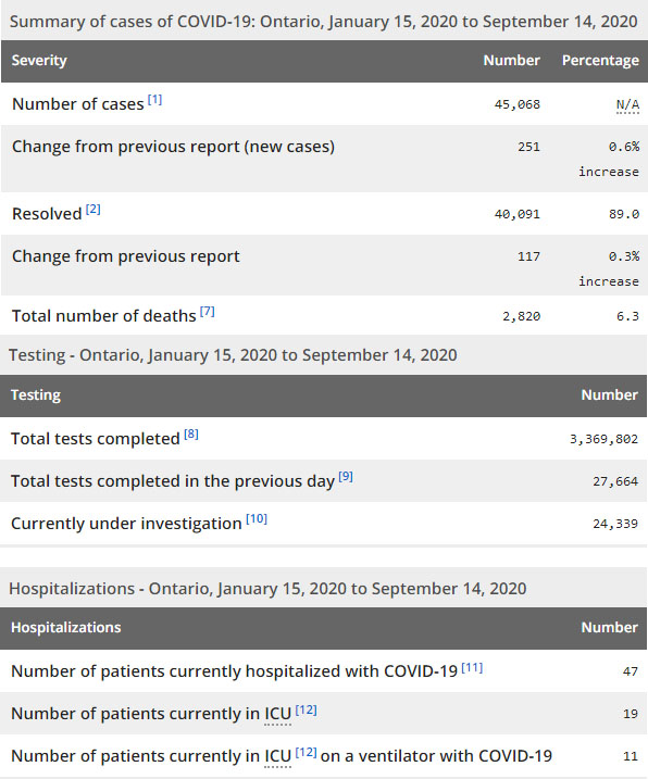 再看看安省方面的详细数据,截止9月14日,安省已对3,369,802例行了新冠病毒检测(检测数较昨天新增27664),还有24339处于被调查阶段。确诊总数45068(较昨天新增251,确诊率下降为0.91%),包括40091例康复(康复率下降仍为89%)、2820例死亡(截止9月15日死亡2862例,这个数据是CBC新闻是基于各地公共卫生部门的数据进行统计的,该方法避免了省级报告系统的滞后时间。死亡人数较昨天增加4例,死亡率仍为6.4%)。住院患者47例(未变);进入ICU患者19例(增加2);IU插呼吸机患者11例(增加3)。