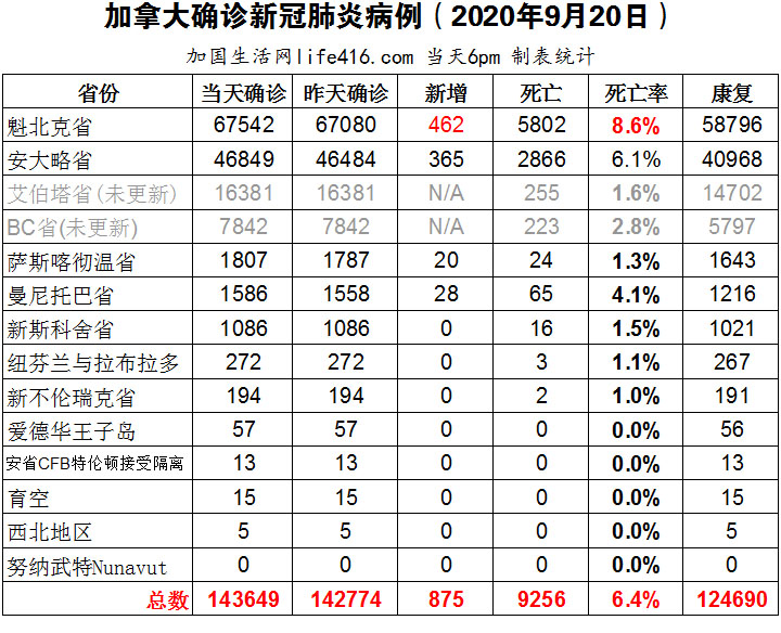 【加国生活网编译报道】截至9月20日下午6点,加拿大确诊新冠病例总数143649(当日新增875),死亡9256。魁省确诊总数67542(当日新增462);安省确诊总数46849(当日新增365);艾省和BC省逢周末未更新。魁省新冠确诊病例再次大幅增长,卫生部宣布几项新公共卫生规则;2名教职员工和2名学生确诊,渥太华一所小学已成为安省第一所关闭的小学;同样是每日新增三四百例,安省为何在疫情“第一波”处于重启第一阶段,而“第二波”却一直没有重新封锁?加国生活网专门制作了如下统计数据表: