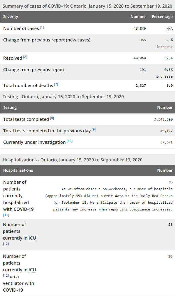 再看看安省方面的详细数据,截止9月19日,安省已对3,548,590例行了新冠病毒检测(检测数较昨天新增40127),还有37671处于被调查阶段。确诊总数46849(较昨天新增365,确诊率下降为0.91%),包括40,968例康复(康复率下降仍为87.4%)、2827例死亡(截止9月20日死亡2866例,这个数据是CBC新闻是基于各地公共卫生部门的数据进行统计的,该方法避免了省级报告系统的滞后时间。死亡人数较昨天未变,死亡率下降为6.1%)。住院患者63例(减少1);进入ICU患者23例(增加3);IU插呼吸机患者10例(未变)。