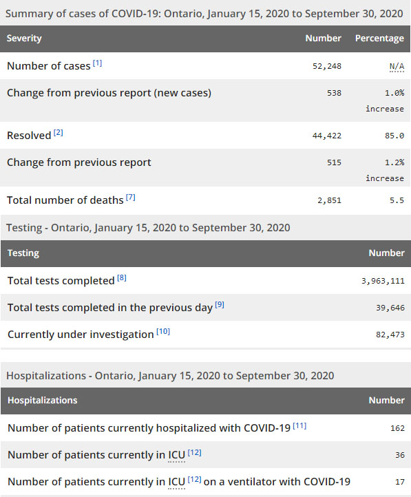 再看看安省方面的详细数据,截止9月30日,安省已对3,963,111例行了新冠病毒检测(检测数较昨天新增39,649),还有82,473处于被调查阶段。确诊总数52,248(较昨天新增538,确诊率下降为1.36%),包括44,422例康复(康复率上升为85%)、2,851例死亡(截止10月1日死亡2888例,这个数据是CBC新闻是基于各地公共卫生部门的数据进行统计的,该方法避免了省级报告系统的滞后时间。死亡人数较昨天增加4例,死亡率下降为5.5%)。住院患者162例(增加12);进入ICU患者36例(增加1);IU插呼吸机患者17例(未变)。