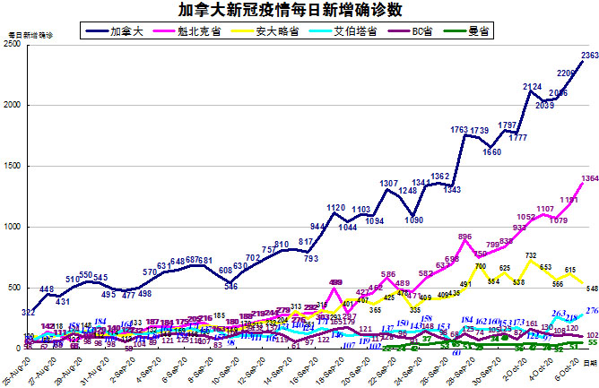 加拿大目前的疫情格局已经不再是魁省和安省确诊病例最多的情况了,其他几个省份也渐渐开始加重起来,“第二波”疫情已经到来,加国生活网小编统计了从8月25日至10月6日的五个省份的新增确诊数,并制作了如下曲线图,大家可以了解一下加拿大目前新冠疫情的发展趋势。加拿大当日新增确诊病例又有所增加,从昨天2206例上升至2363例,按新增确诊数按省份排列分别是:魁省新增1364、安省新增548、艾省新增276、BC省新增102、曼省新增55。