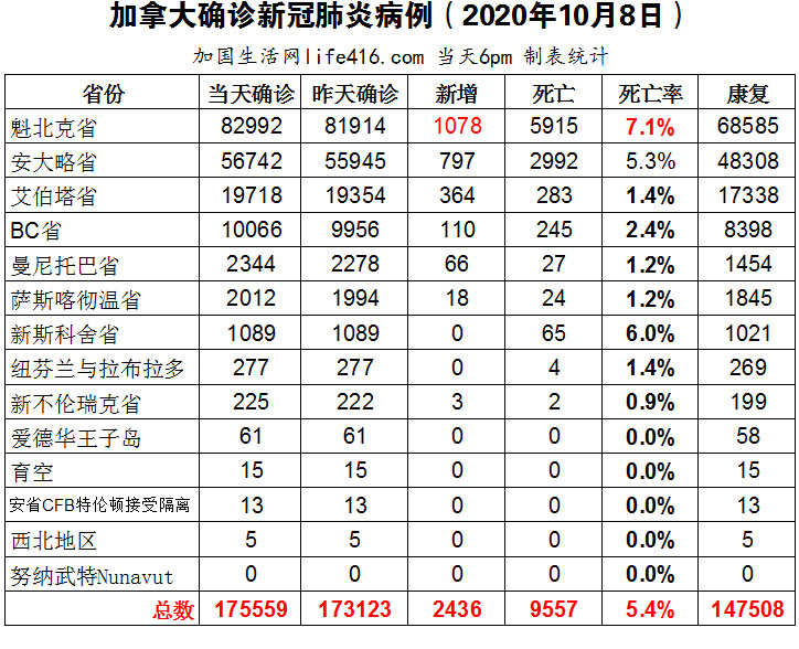 【加国生活网编译报道】截至10月8日下午6点,加拿大确诊新冠病例总数175559(当日新增2436),死亡9557。魁省确诊总数82992(当日新增1078);安省确诊总数56742(当日新增797);艾省确诊总数19718(当日新增364);BC省确诊总数10066(当日新增110)。BC省新冠确诊病例总数超过1万多,跨越疫情另一个严峻的里程碑;艾省新增364例创自疫情以来最高值;安省新增797例,三创自疫情爆发以来最高值;多伦多餐馆最新卫生法规从10月8日起生效。加国生活网专门制作了如下统计数据表: